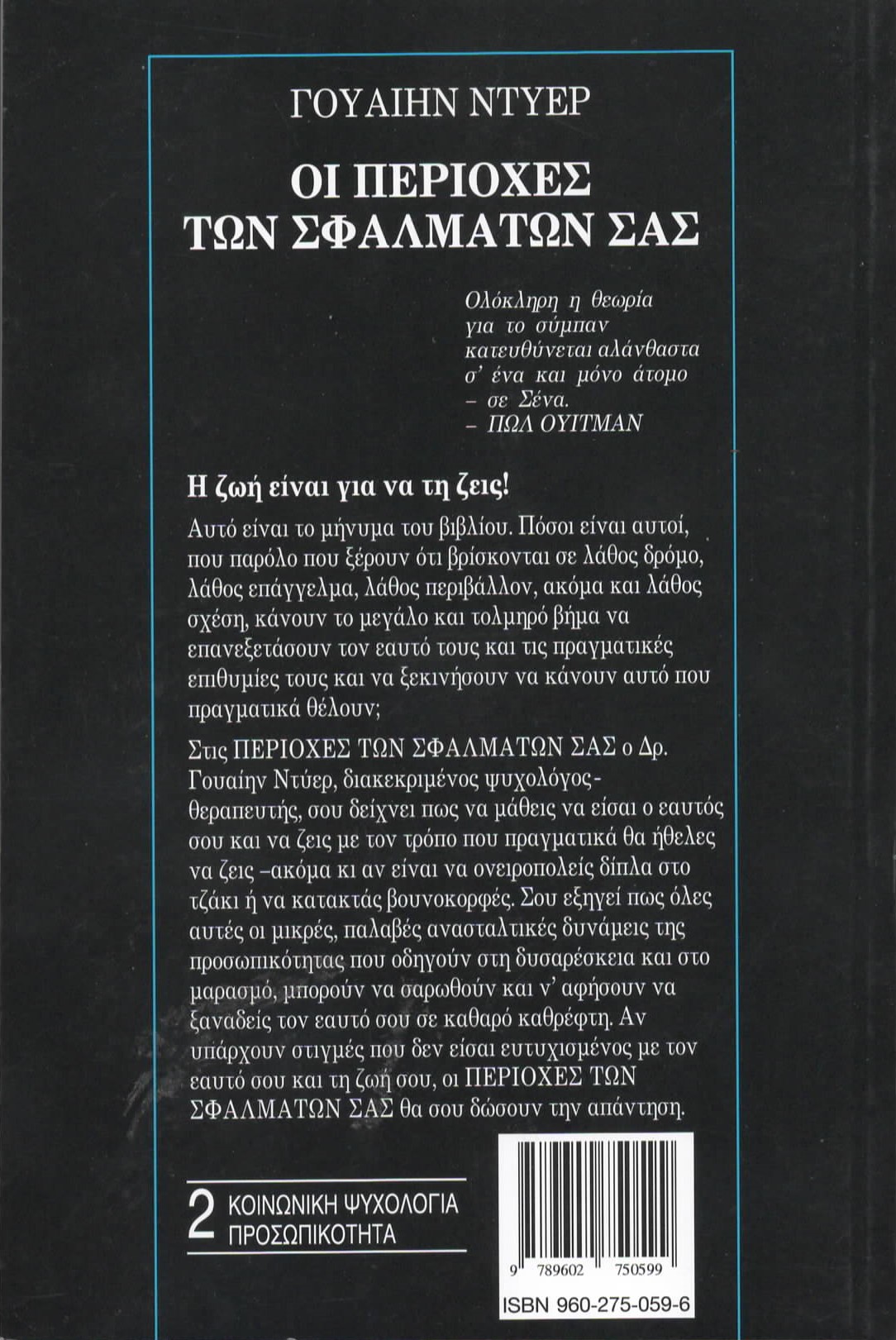 Η ζωή είναι για να τη ζεις! Αυτό είναι το μήνυμα του βιβλίου. Πόσοι είναι αυτοί που παρόλο που ξέρουν ότι βρίσκονται σε λάθος δρόμο, λάθος επάγγελμα, λάθος περιβάλλον, ακόμα και λάθος σχέση, κάνουν το μεγάλο και τολμηρό βήμα να επανεξετάσουν τον εαυτό τους και τις πραγματικές επιθυμίες του και να ξεκινήσουν να κάνουν αυτό που πραγματικά θέλουν; Στις «Περιοχές των σφαλμάτων σας» ο Δρ. Γουαίην Ντύερ (. . .) σου δείχνει πώς να μάθεις να είσαι ο εαυτός σου και να ζεις με τον τρόπο που πραγματικά θα ήθελες να ζεις – ακόμα κι αν είναι να ονειροπολείς δίπλα στο τζάκι ή να κατακτάς βουνοκορφές.